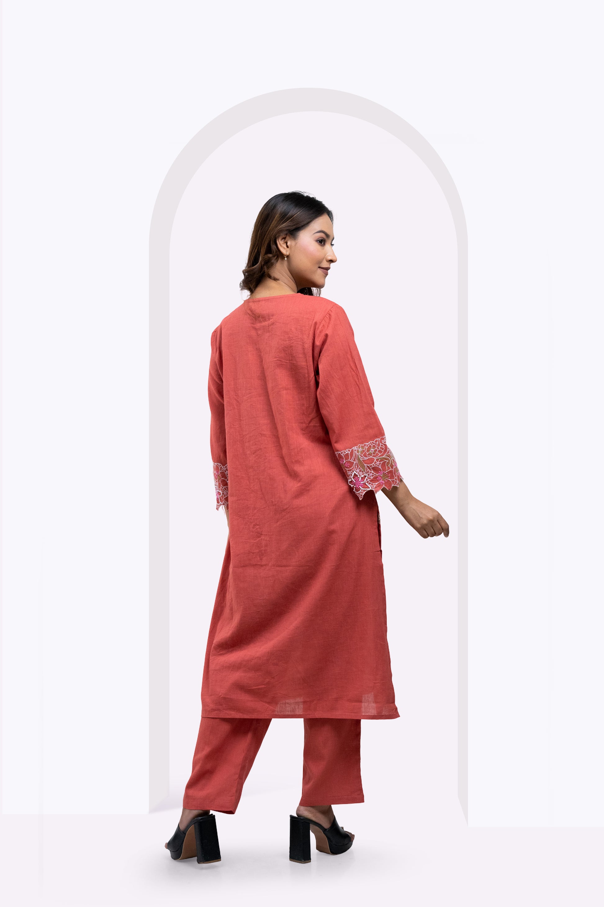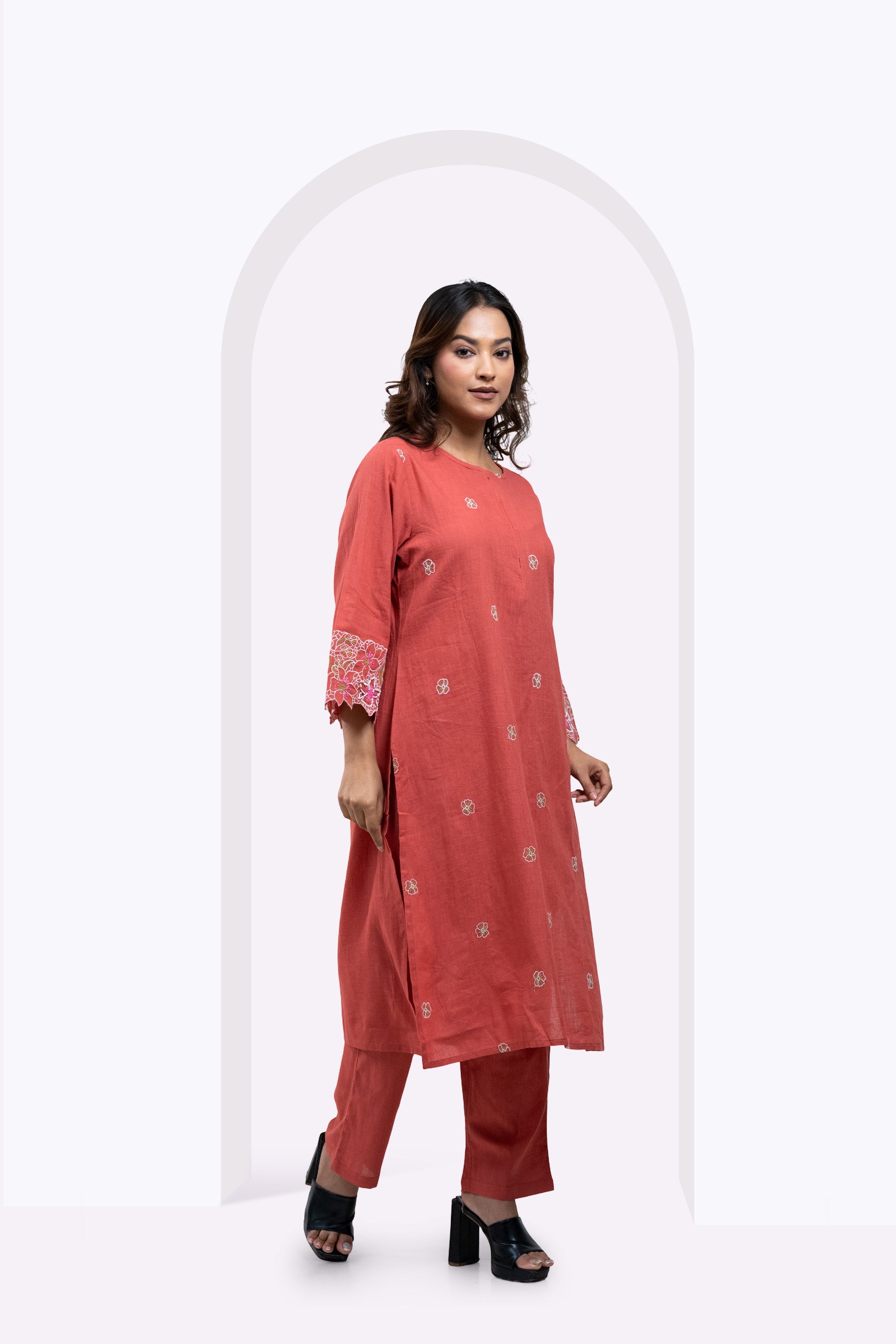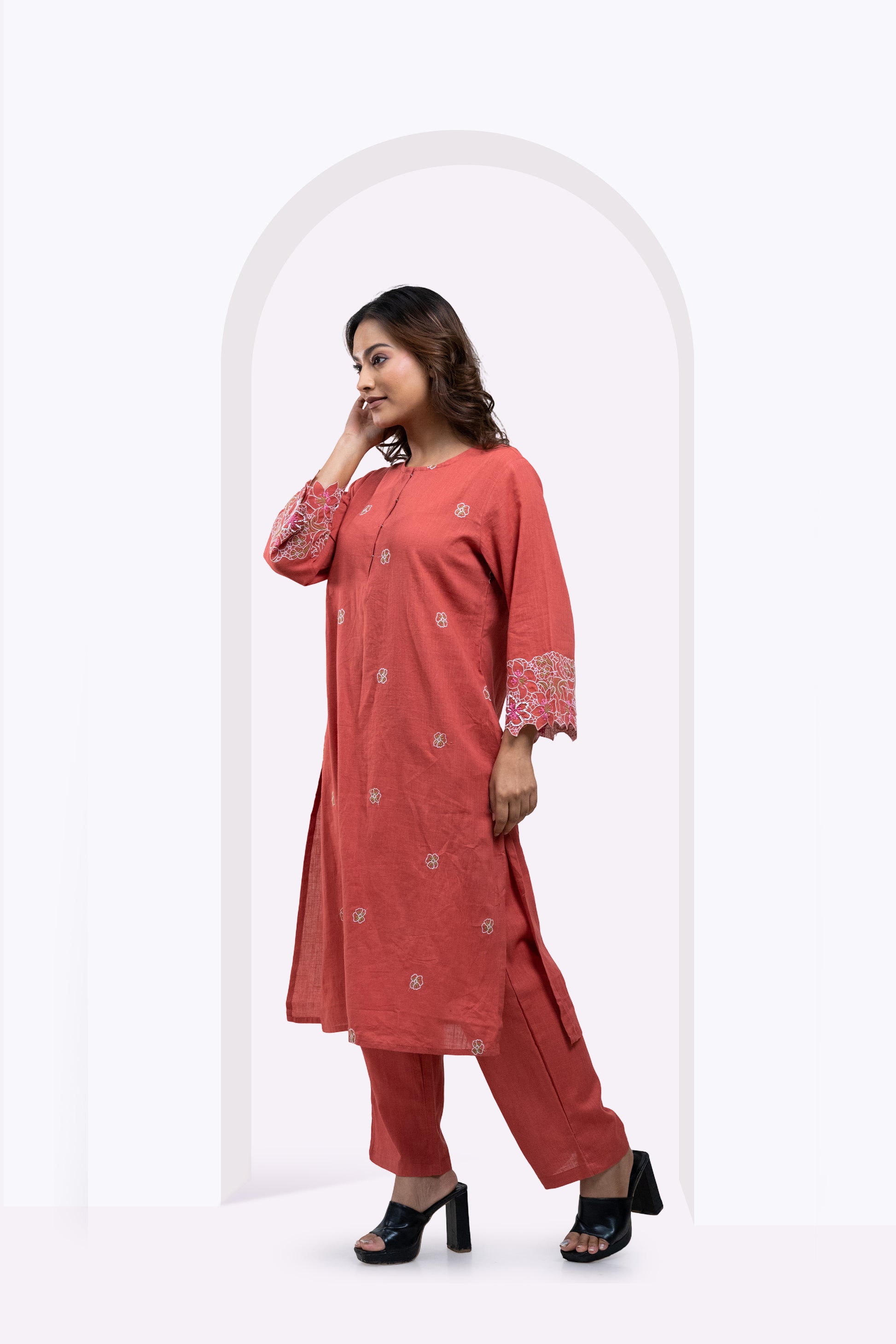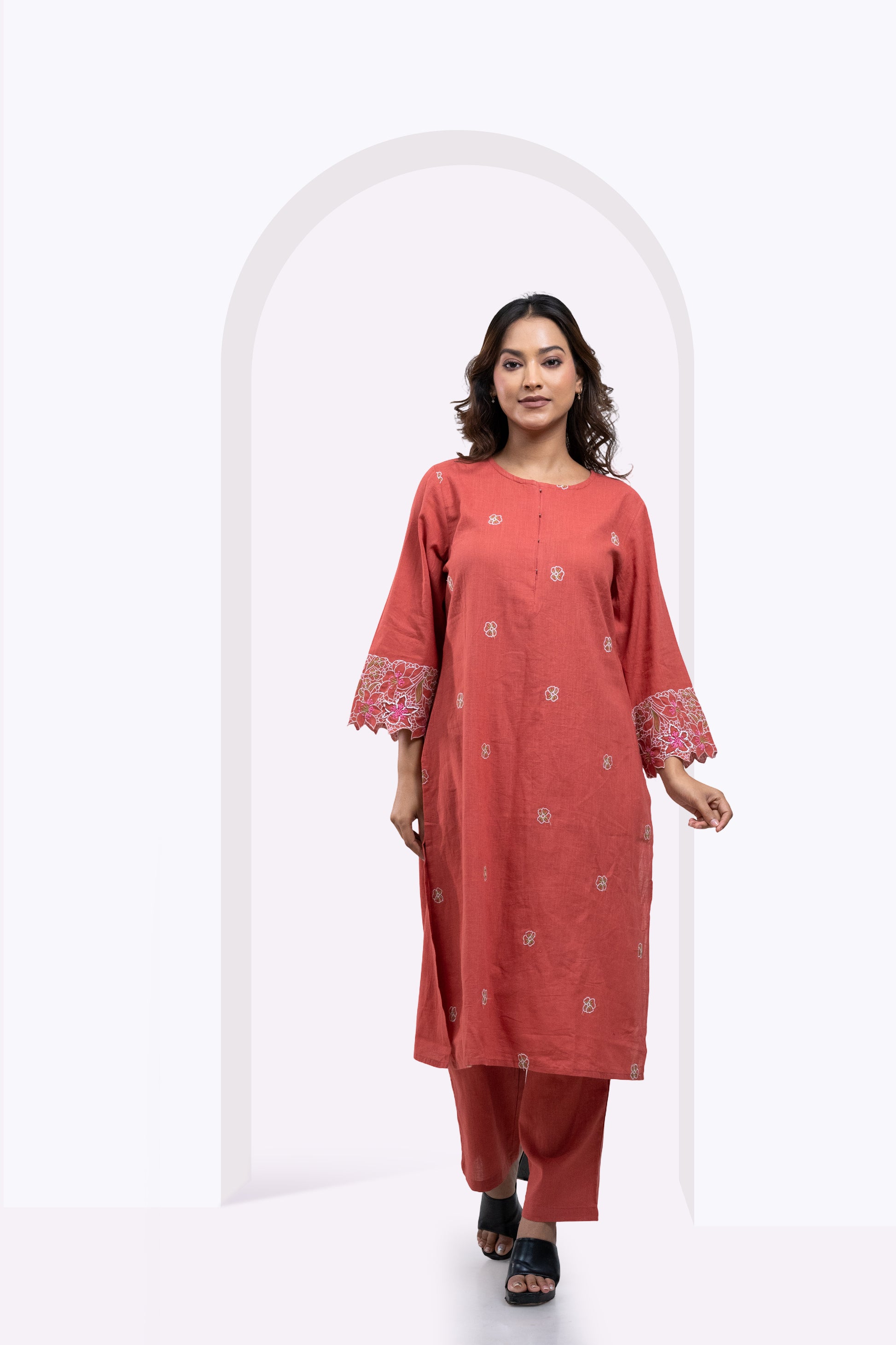 Elevate your wardrobe with the Blush Bloom Edit, a blush orange co-ord set crafted from premium breathable cotton for lasting comfort. The straight kurta features intricate all-over floral embroidery and striking embroidered cuffs, delivering refined elegance. Paired with relaxed-fit bottoms, this ensemble perfectly balances contemporary style and traditional craftsmanship for versatile, effortless wear.