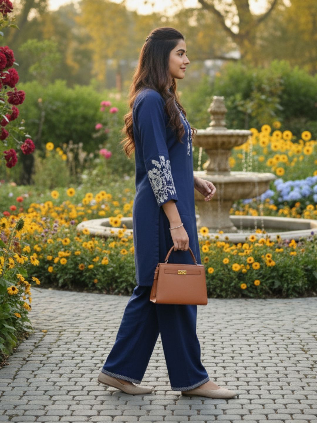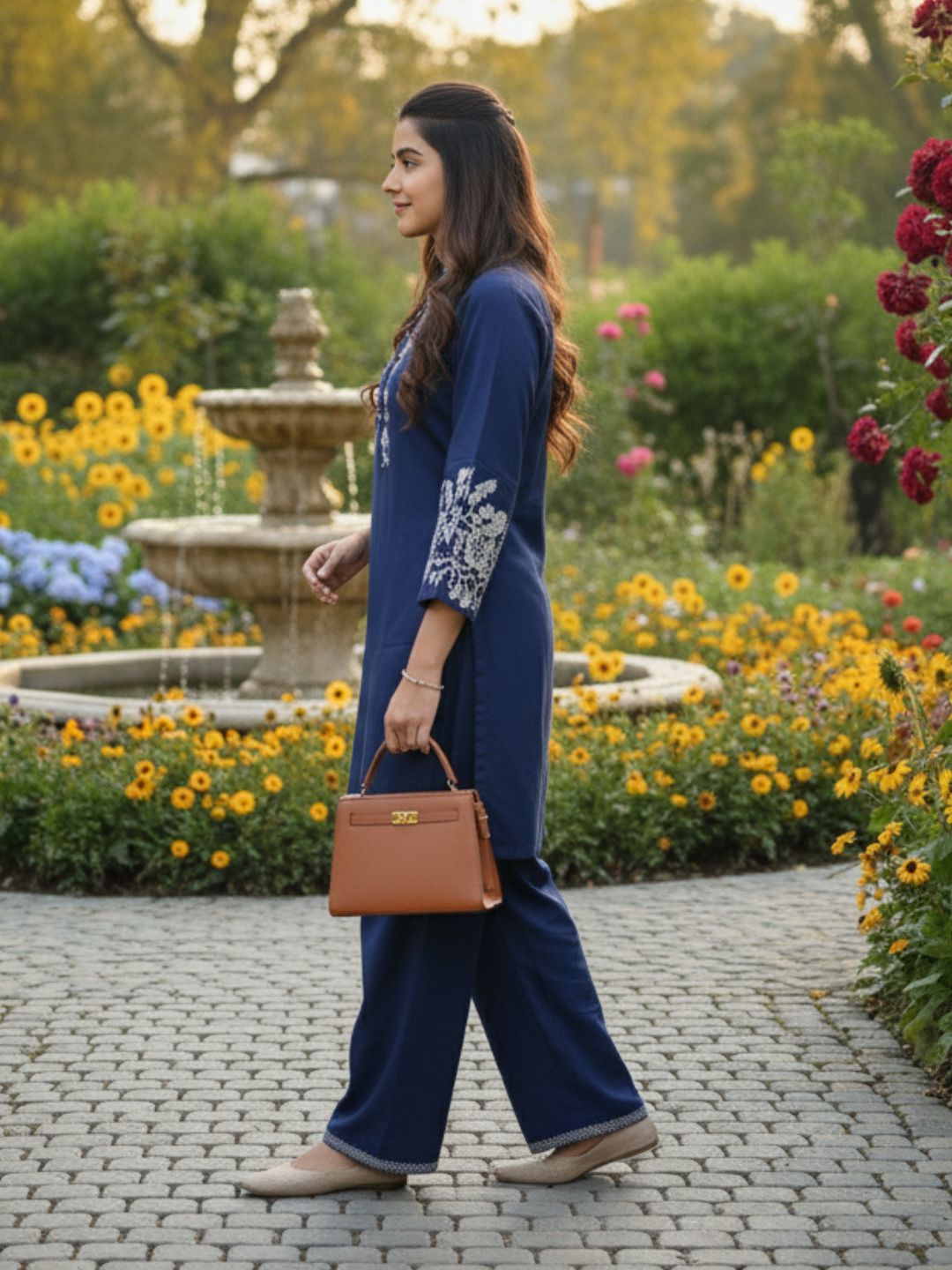 Exude understated elegance with this sophisticated navy set featuring an elegant Chinese collar design. Crafted from premium cotton, this piece showcases intricate cross-stitch embroidery detailing that adds refined texture and visual interest. The three-quarter sleeves offer a versatile silhouette perfect for layering or wearing standalone. Ideal for those who appreciate traditional craftsmanship blended with contemporary style, this set delivers both comfort and distinctive character for everyday wear or special occasions.