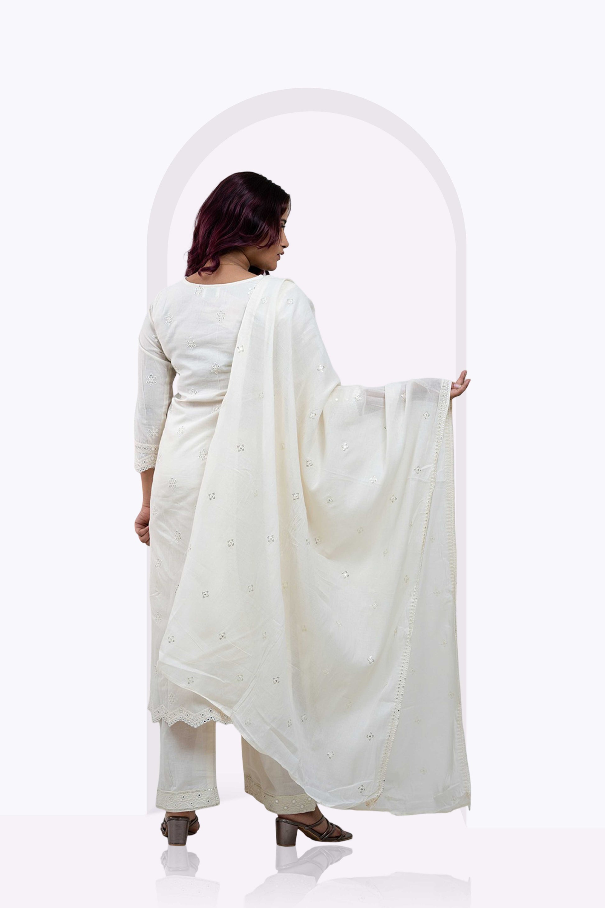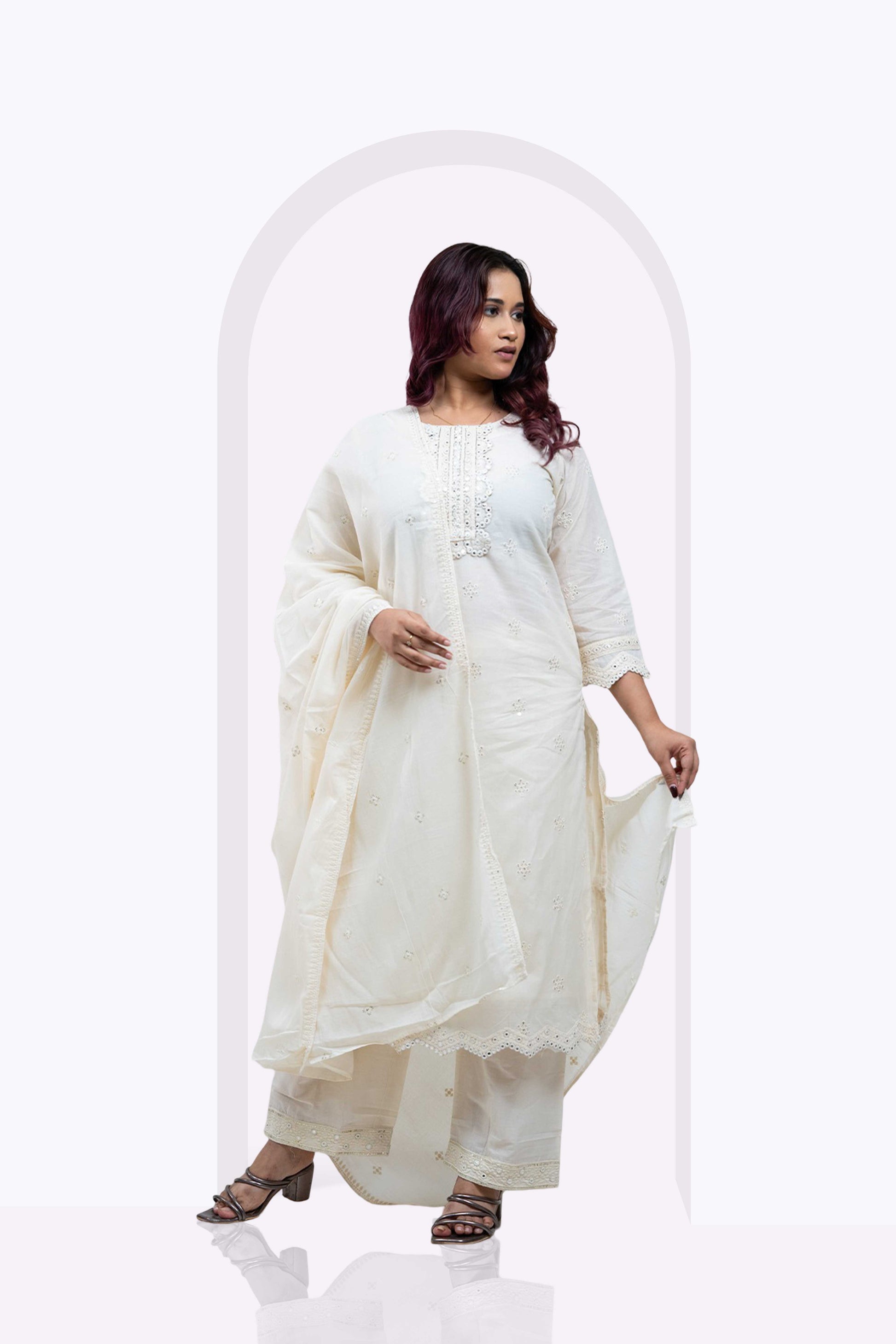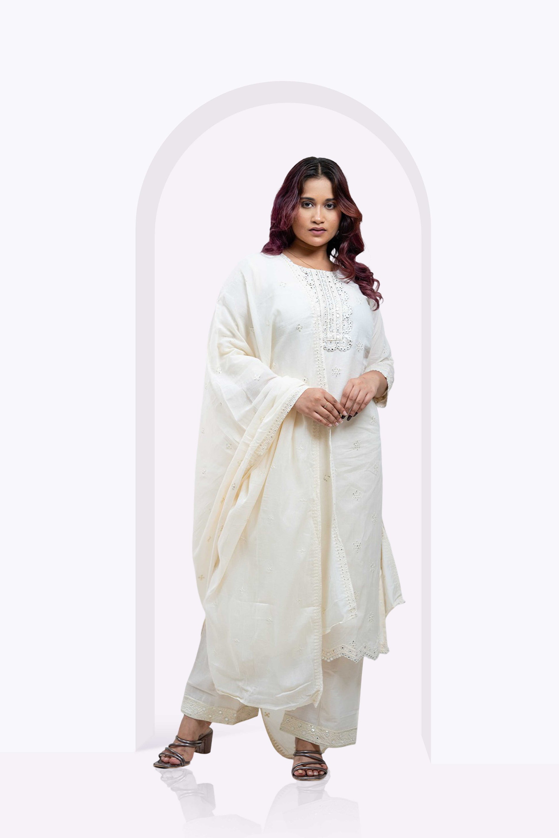 The GRACEFUL EDIT 3-piece set combines elegance and comfort with its pure white cotton fabric, tailored in a straight fit to offer a polished silhouette. Designed for festive occasions, this outfit requires dry cleaning to maintain its pristine quality and texture. Perfect for those seeking a refined yet breathable ensemble, it ensures style without compromising on ease.