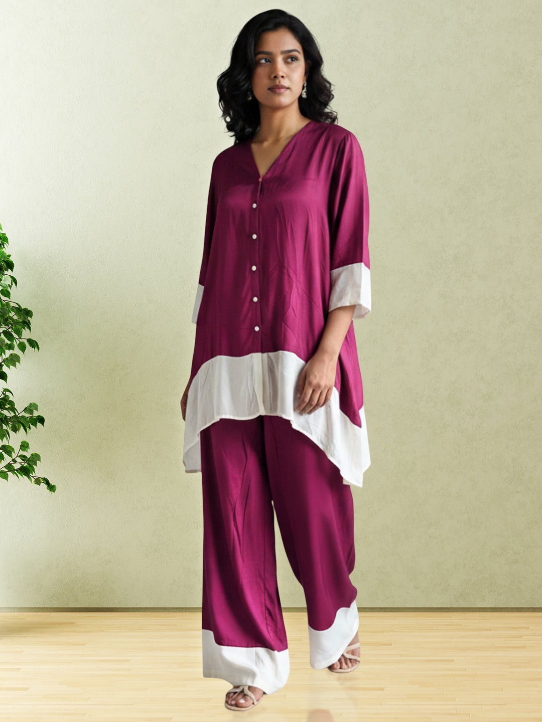 Elevate your everyday style with this women’s color-block co-ord set, designed for effortless elegance and all-day comfort. This two-piece outfit includes a flowy V-neck tunic with front buttons and matching wide-leg pants, crafted in a striking magenta and ivory contrast design that delivers a chic, contemporary look.