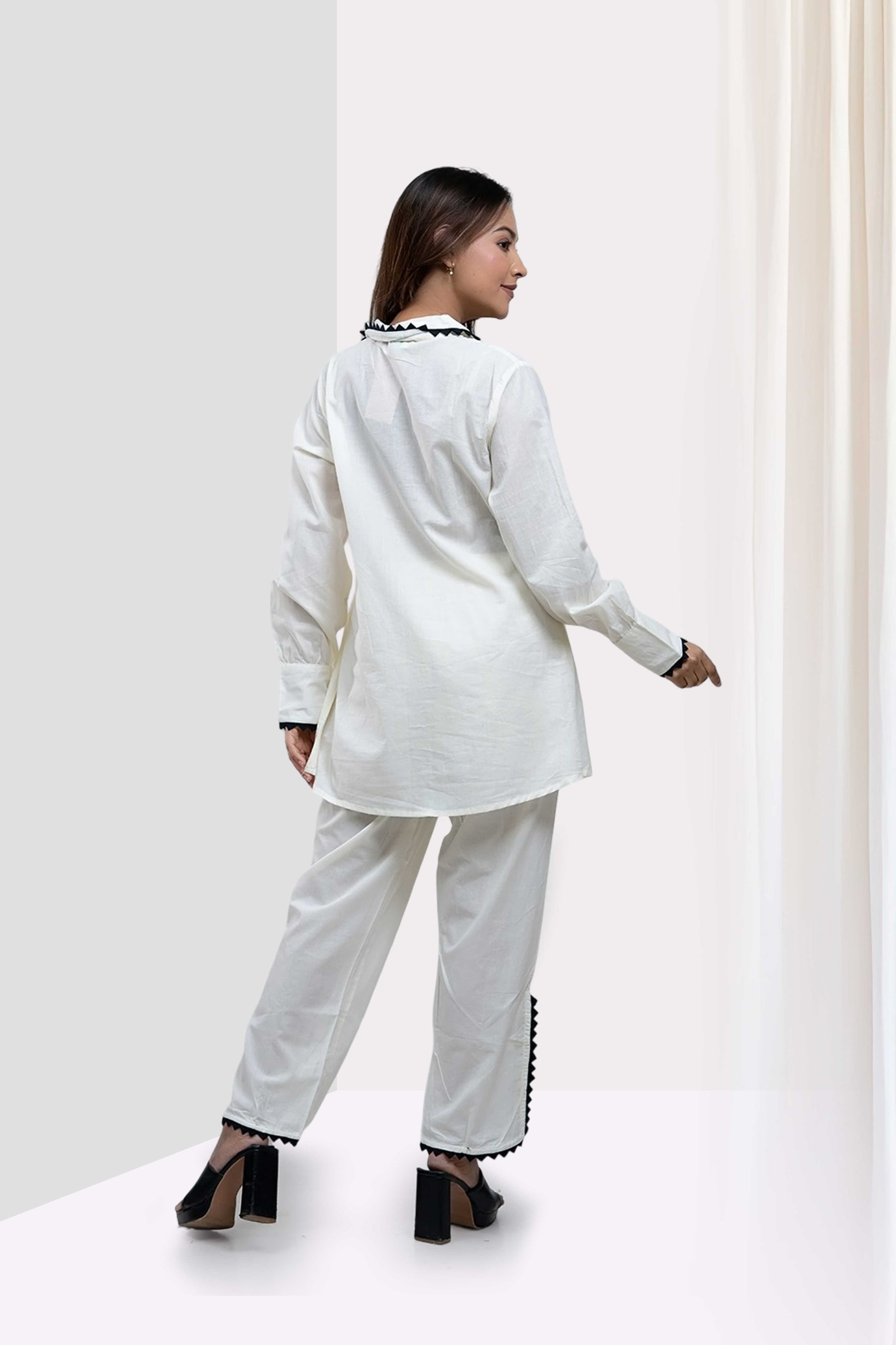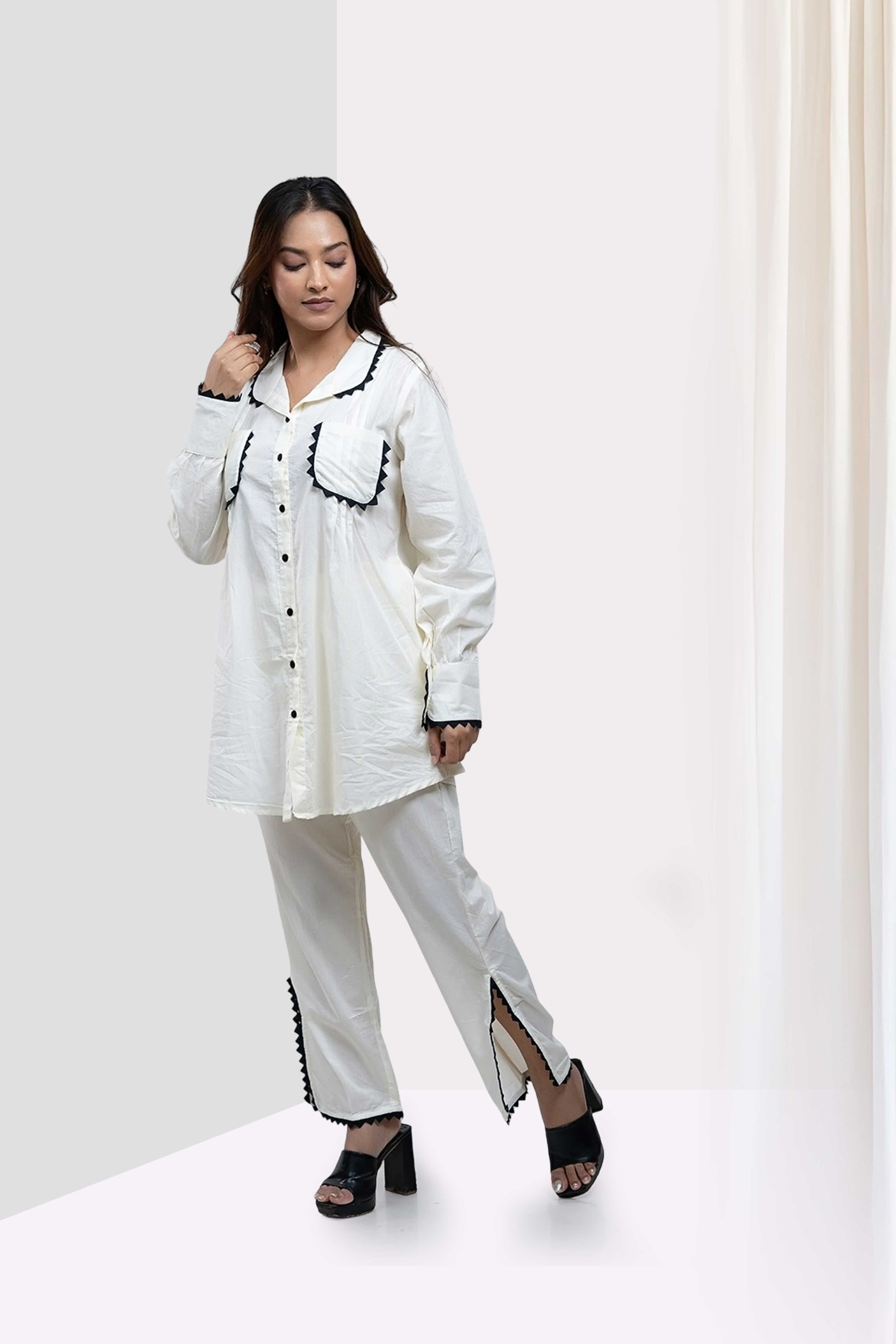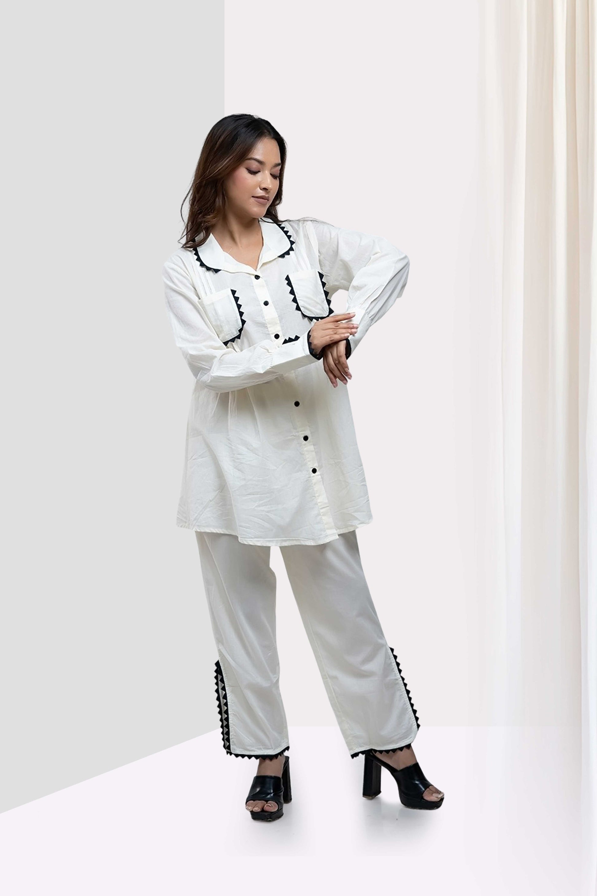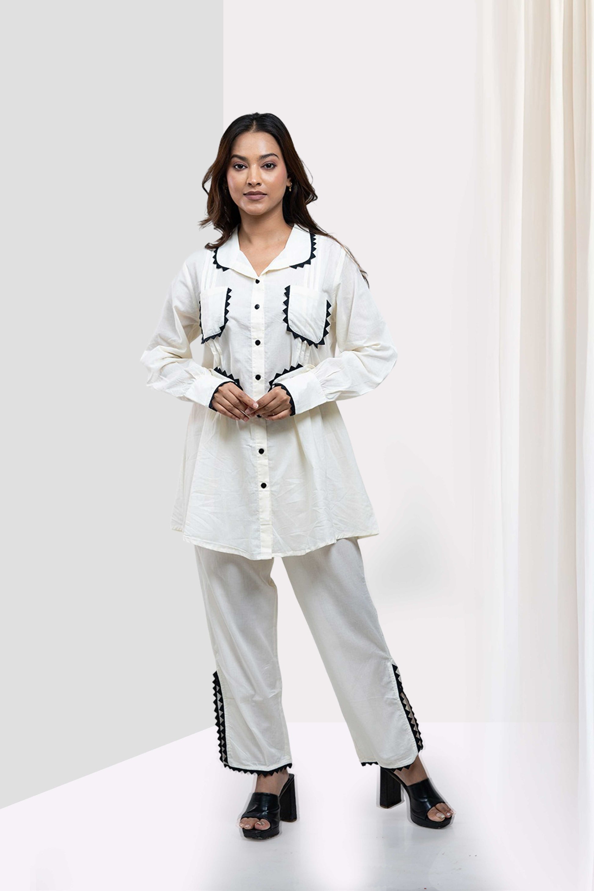 Elevate your wardrobe with the MONOCHROME EDIT co-ord set, expertly tailored from 100% premium cotton for superior comfort and breathability. This minimalist ensemble features a longline button-down shirt and straight-fit pants, offering versatile styling options. The subtle contrast of black trims on pockets, cuffs, and pant hemlines adds refined sophistication, enhancing the classic white silhouette without overpowering it. Designed for those who appreciate understated elegance with a distinctive edge.