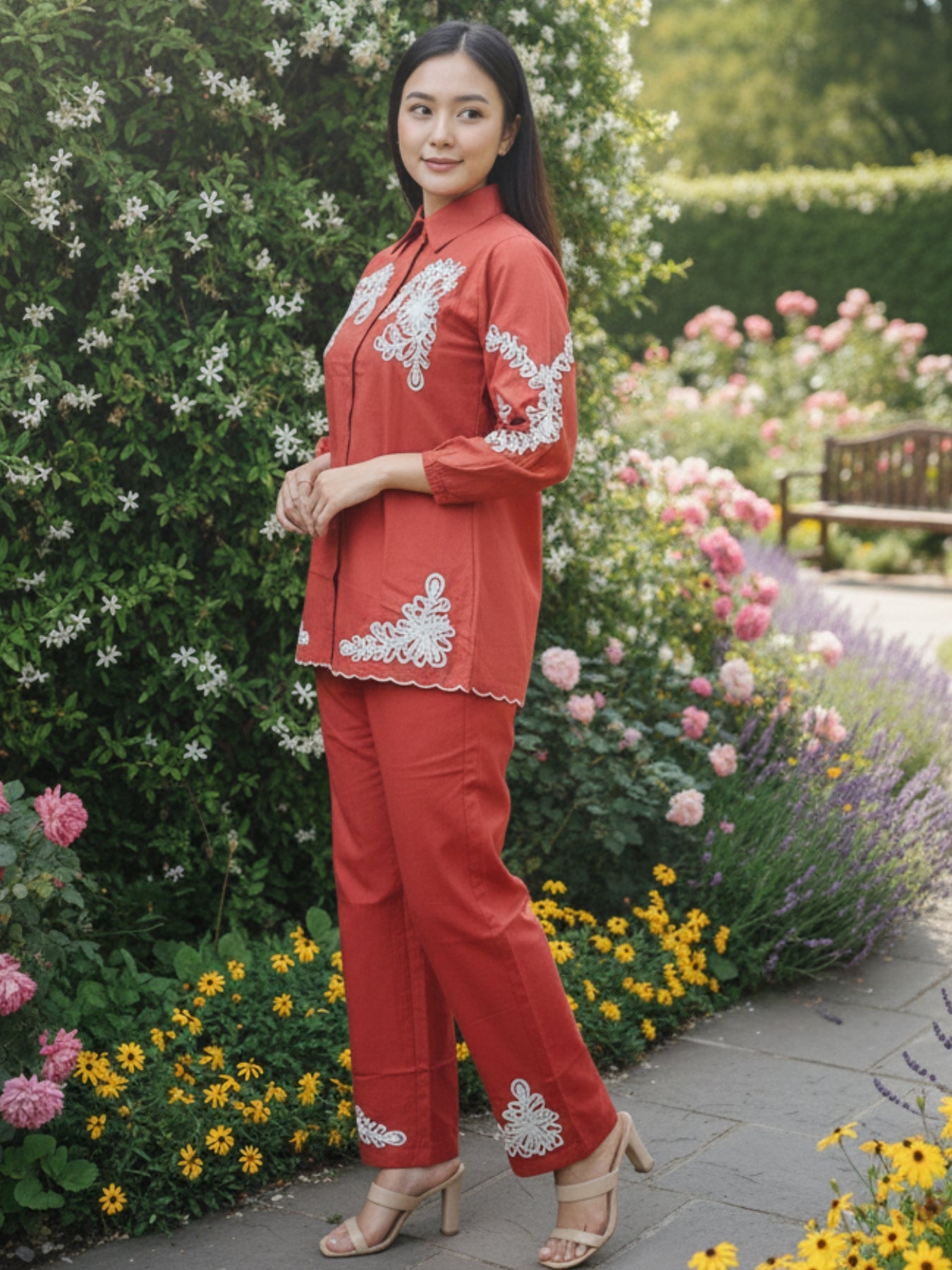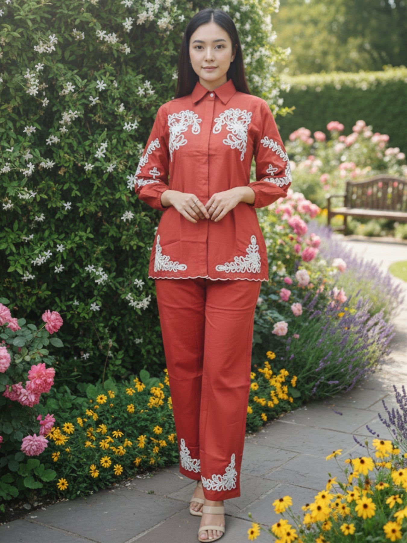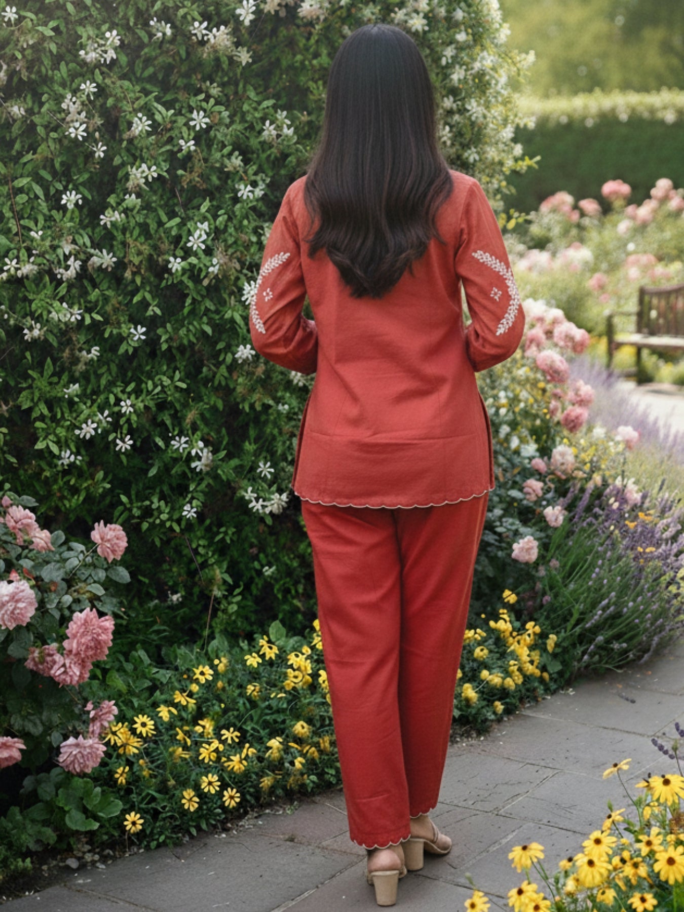Elevate your wardrobe with this sophisticated rust-hued coordinate set, expertly crafted from premium cotton for all-day comfort and breathability. The refined shirt collar adds a polished silhouette, while intricate embroidery detailing brings artisanal elegance to every wear. Perfect for transitioning from casual gatherings to semi-formal occasions, this versatile ensemble combines timeless design with contemporary styling. The natural cotton fabric ensures durability and easy maintenance, making it an essential addition to your collection.