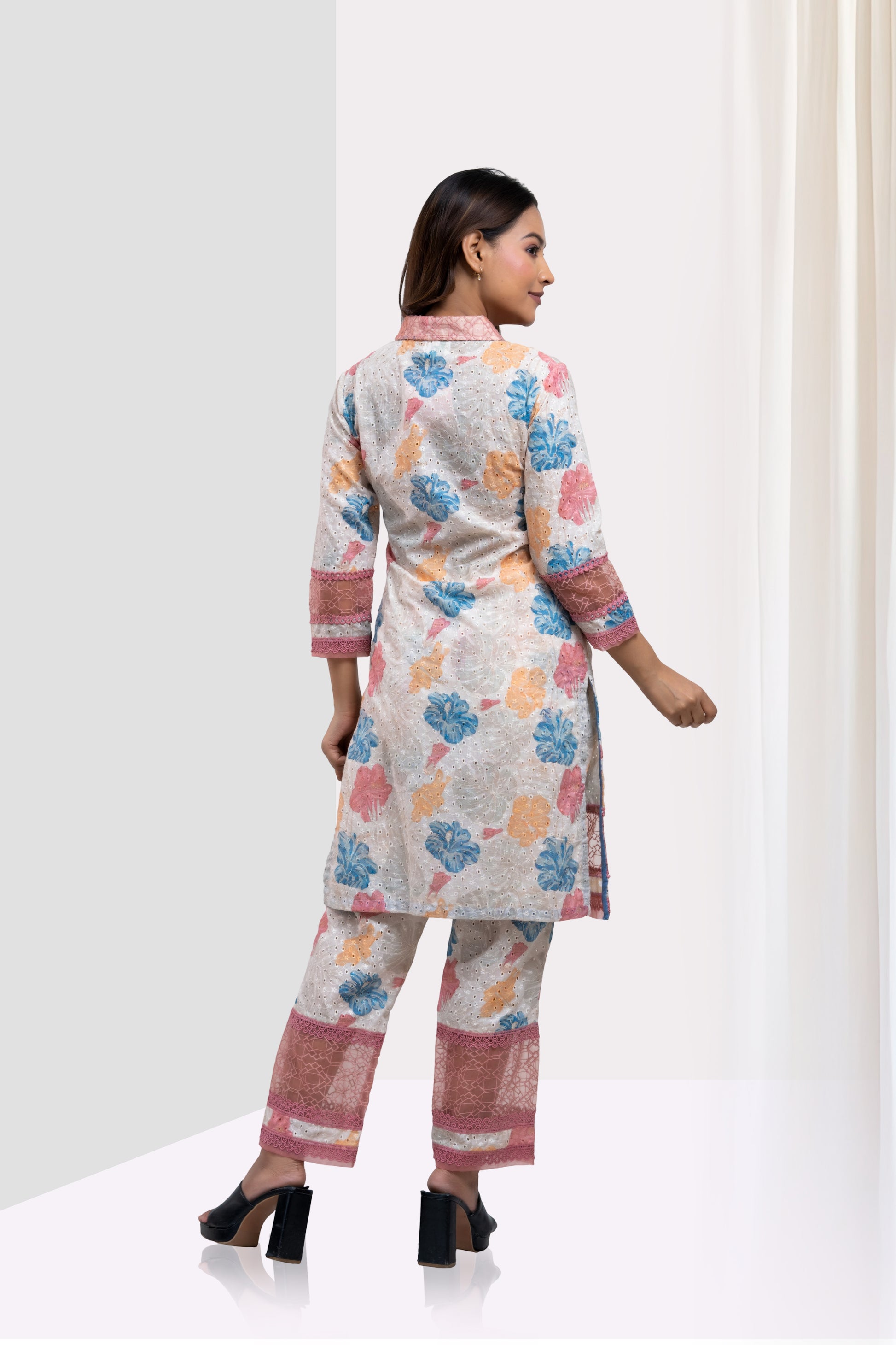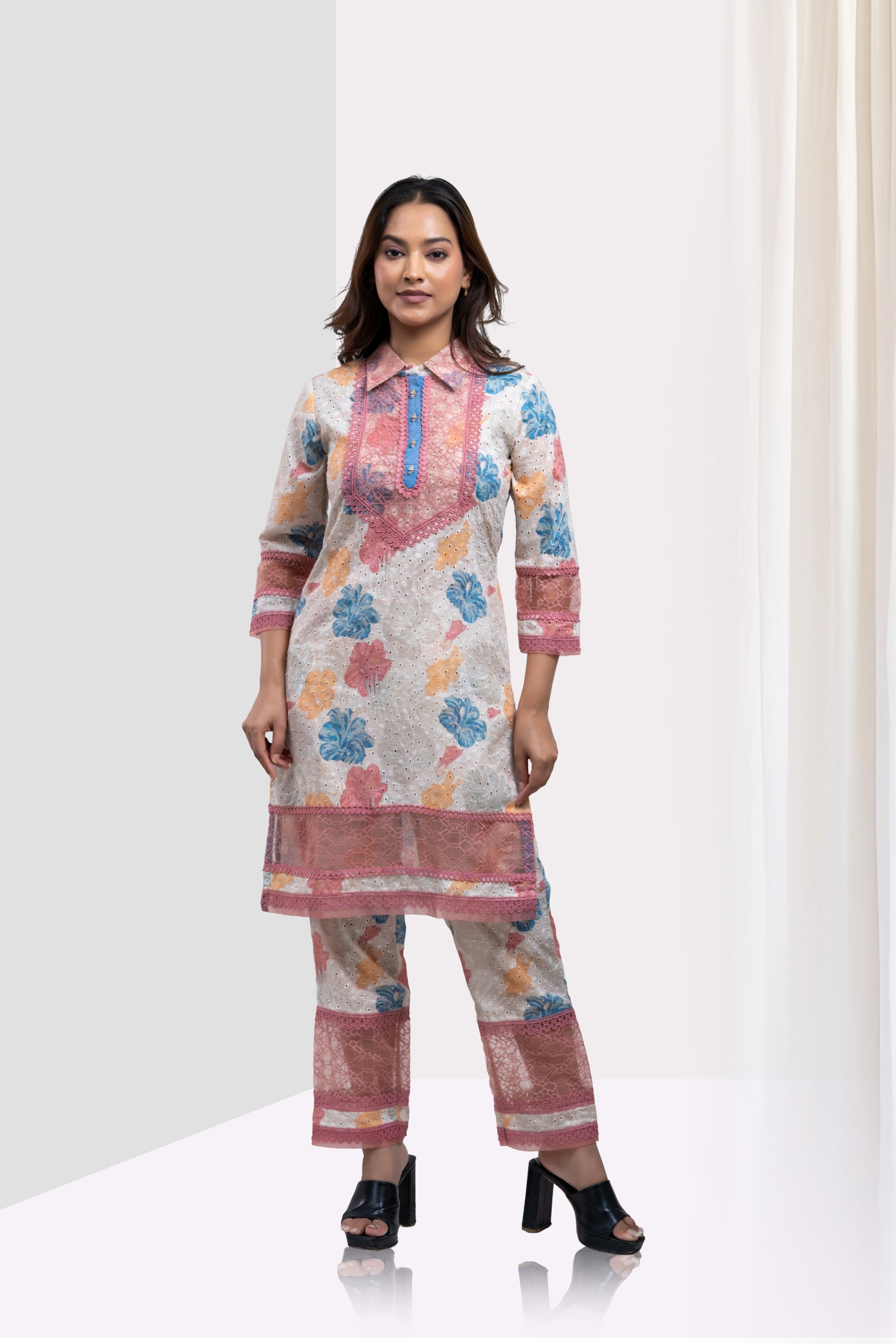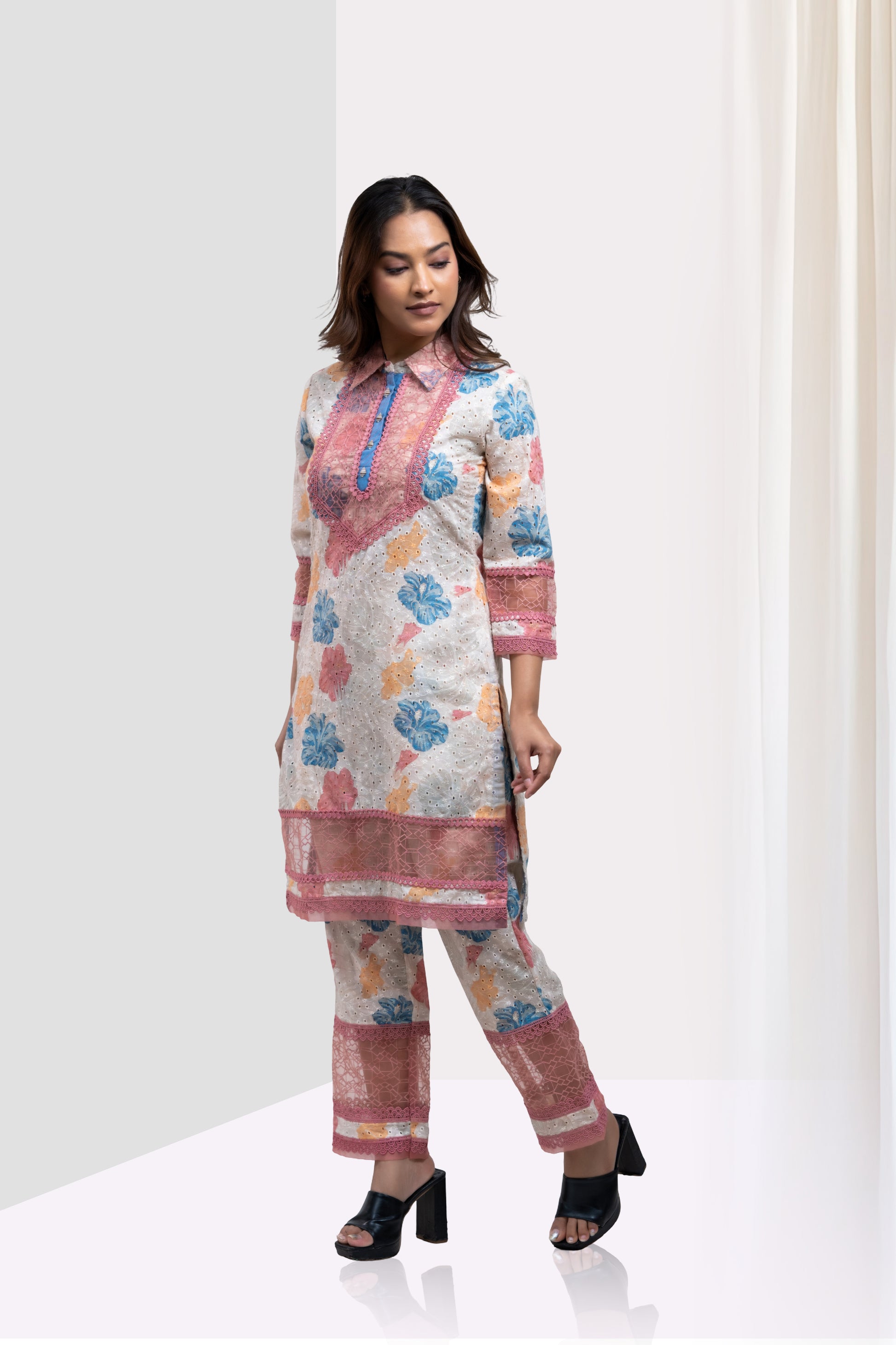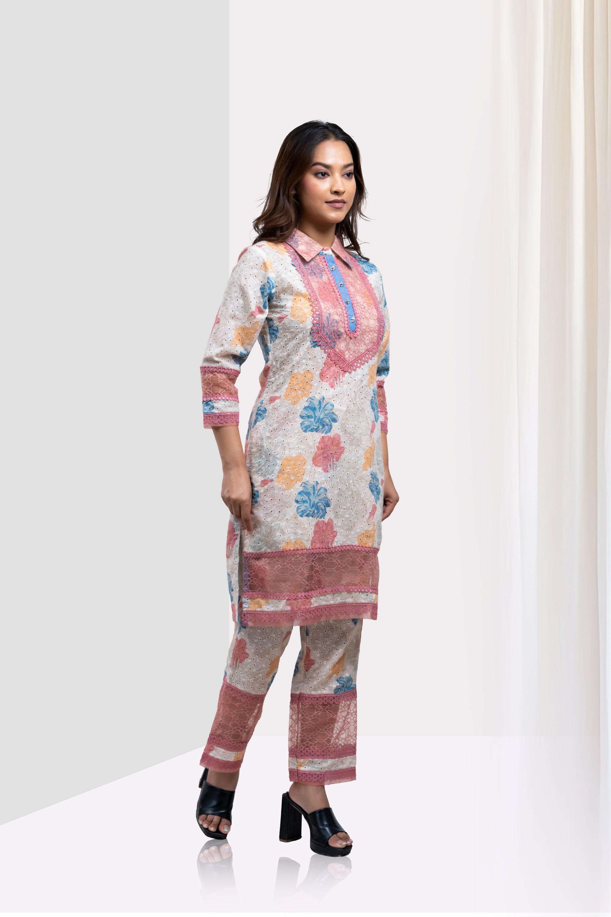 Elevate your wardrobe with the Pastel Bloom Edit, featuring a harmonious blend of cream cotton fabric designed for comfort and style. This collection effortlessly transitions between casual, office, and fusion looks, offering versatile coordination options. Its breathable material ensures all-day ease while maintaining a polished appearance, perfect for the modern professional seeking understated elegance.