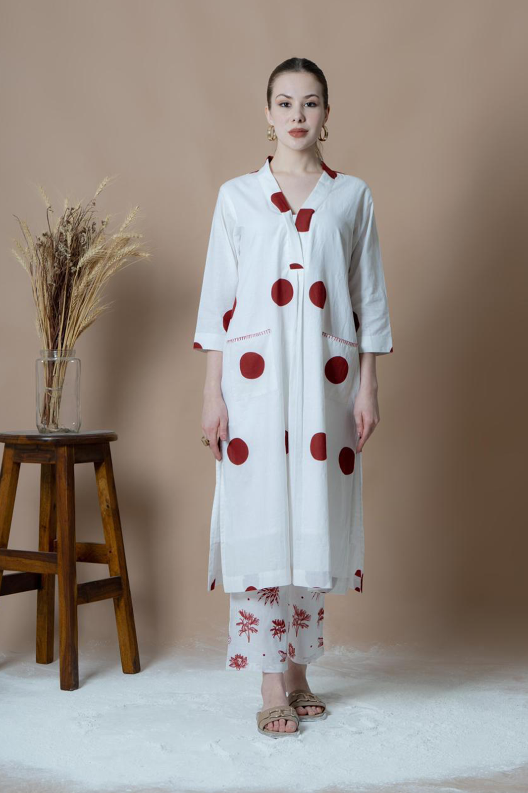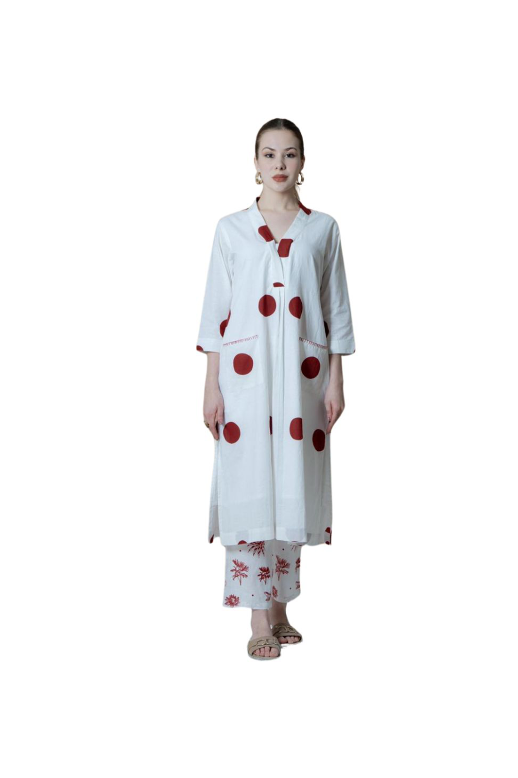 Upgrade your ethnic wardrobe with this white cotton kurta set for women, featuring bold red polka prints on the kurta and floral printed straight pants. Crafted from breathable pure cotton, this set combines comfort with style, making it perfect for office wear, casual outings, and summer festivities. The A-line kurta with contrast detailing and functional pockets adds a modern twist, while the floral pants bring in a playful charm. A versatile ethnic co-ord set that blends elegance and everyday ease effortlessly.