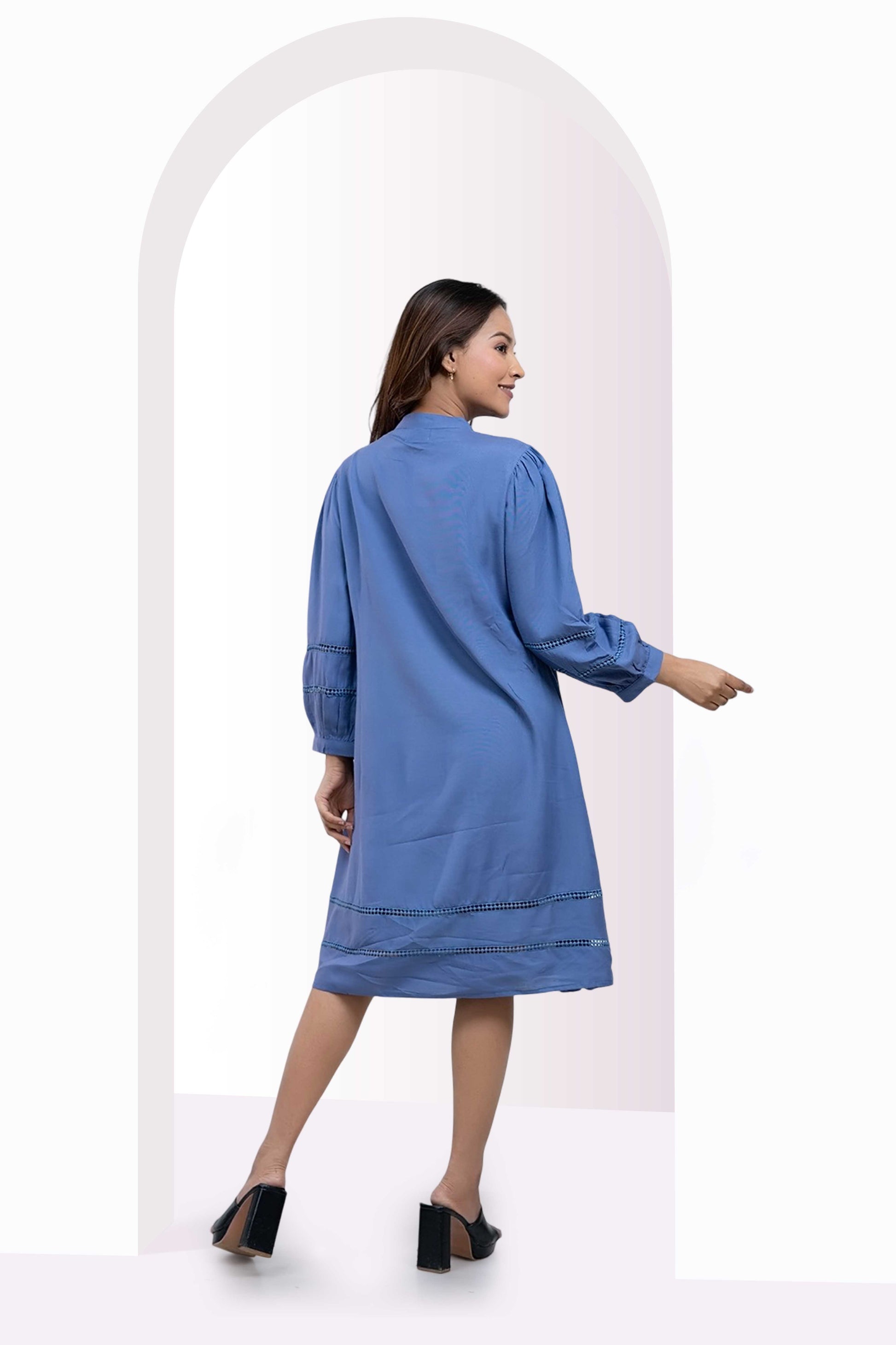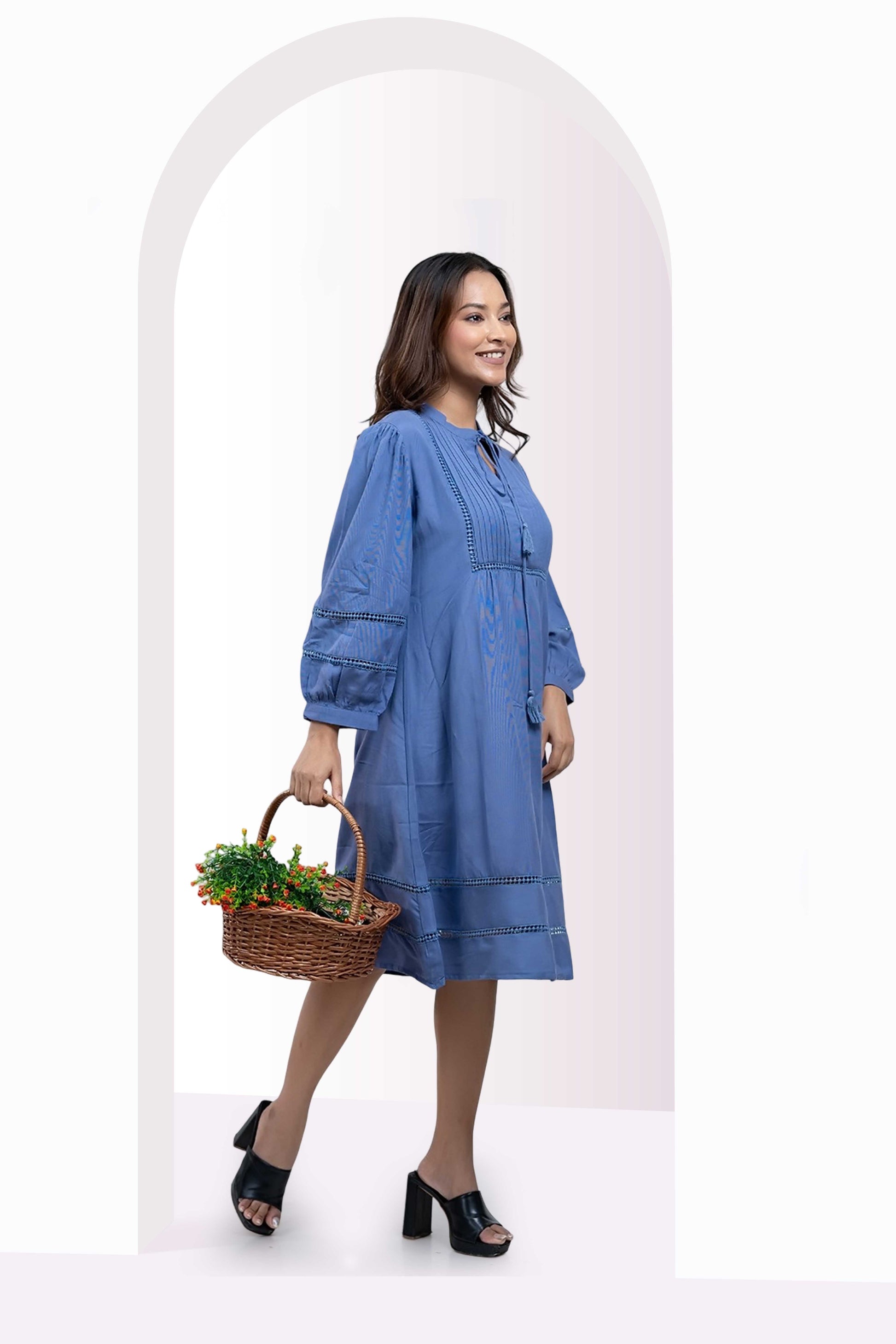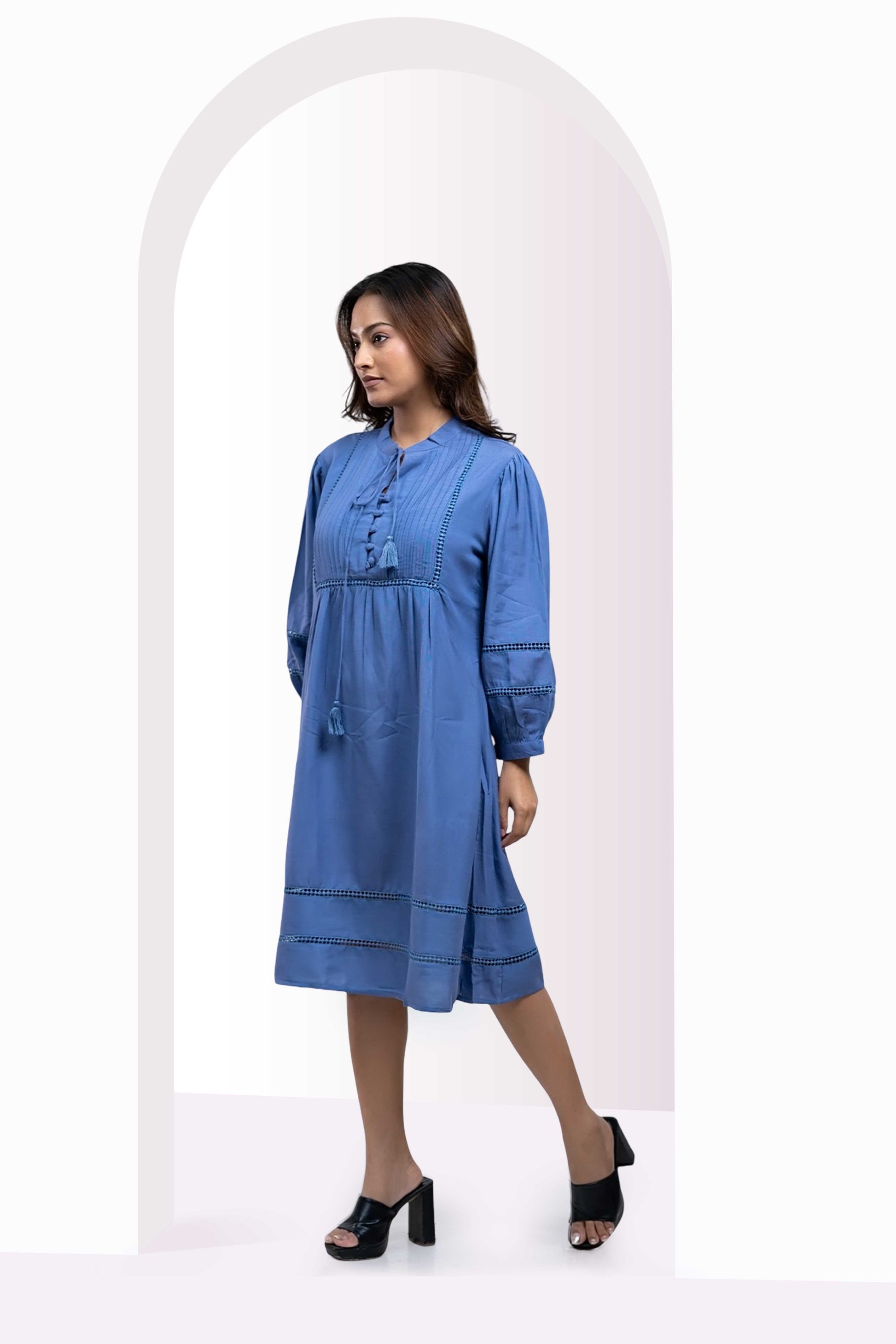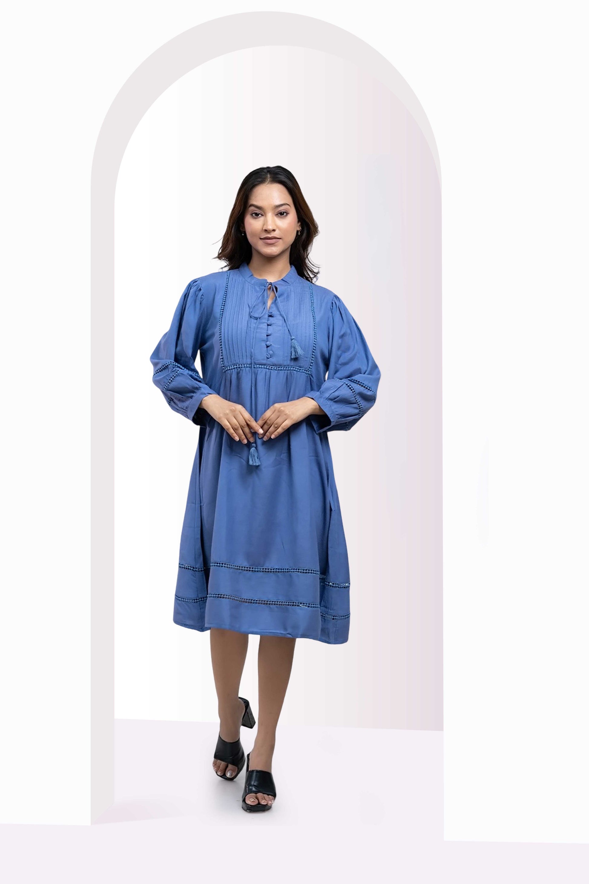 This blue cotton midi dress combines comfort and refined style with its 100% breathable fabric and relaxed A-line fit. Expertly detailed with pintucks on the yoke and subtle embroidery on the sleeves and hem, it elevates everyday wear. The band collar with a tasseled tie and gathered balloon sleeves introduce a sophisticated charm, making it an ideal choice for those who value effortless elegance in their wardrobe.